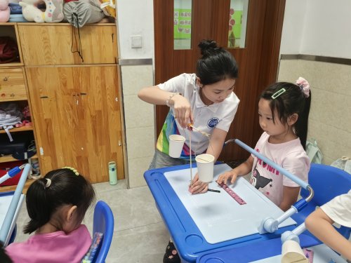 在简易投影仪实践环节,志愿者引导学生先在纸杯底部粘贴透明胶带,并用水彩笔绘制专属图案,再利用手机光源对准图案进行调试。当学生通过调整手机与纸杯的距离,在墙面上看到倒立、放大的清晰图案时,纷纷表现出浓厚兴趣和好奇心。志愿者借此机会,简要讲解凸透镜成像的基本原理,通过“为什么图案会倒立”“怎样让图像更清楚”等互动提问,进一步激发学生对光学知识的探索热情。